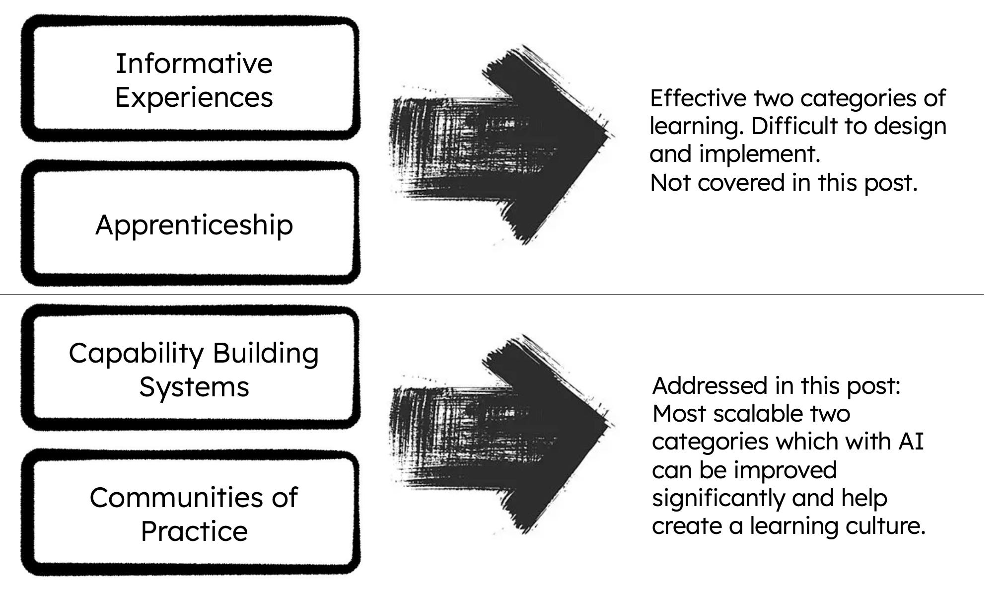 Why Focus on Systems and Communities? While experiences and apprenticeship remain vastly valuable, AI and modern tools are dramatically improving the effectiveness of capability development systems and communities of practice. This represents the biggest opportunity for scalable impact in organizational learning and collaboration.